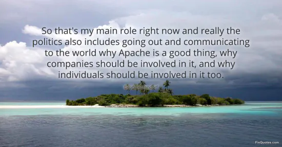 Behlendorf, Brian. (2026, January 17). So that's my main role right now and really the politics also includes going out and communicating to the world why Apache is a good thing, why companies should be involved in it, and why individuals should be involved in it too. FixQuotes. https://fixquotes.com/quotes/so-thats-my-main-role-right-now-and-really-the-40495/