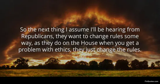 Reid, Harry. "So the next thing I assume I'll be hearing from Republicans, they want to change rules some way, as they do on the House when you get a problem with ethics, they just change the rules." FixQuotes. January 16, 2026. https://fixquotes.com/quotes/so-the-next-thing-i-assume-ill-be-hearing-from-105644/.
