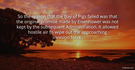 Hunt, E. Howard. "So the reason that the Bay of Pigs failed was that the original promise made by Eisenhower was not kept by the subsequent Administration. It allowed hostile air to wipe out the approaching invasion force." FixQuotes. January 16, 2026. https://fixquotes.com/quotes/so-the-reason-that-the-bay-of-pigs-failed-was-100140/.