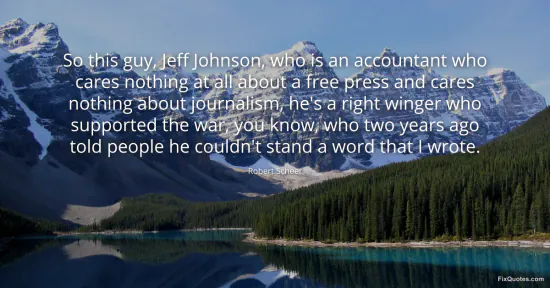 Scheer, Robert. "So this guy, Jeff Johnson, who is an accountant who cares nothing at all about a free press and cares nothing about journalism, he's a right winger who supported the war, you know, who two years ago told people he couldn't stand a word that I wrote." FixQuotes. January 16, 2026. https://fixquotes.com/quotes/so-this-guy-jeff-johnson-who-is-an-accountant-who-102463/.