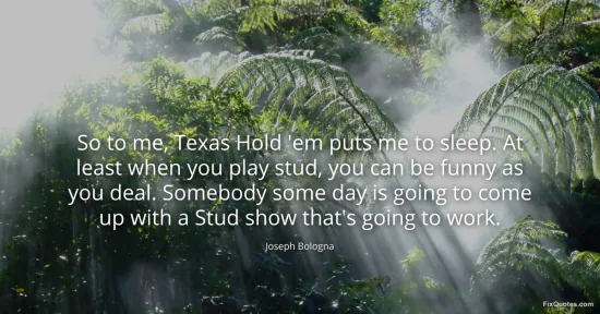 Bologna, Joseph. "So to me, Texas Hold 'em puts me to sleep. At least when you play stud, you can be funny as you deal. Somebody some day is going to come up with a Stud show that's going to work." FixQuotes. January 16, 2026. https://fixquotes.com/quotes/so-to-me-texas-hold-em-puts-me-to-sleep-at-least-84034/.
