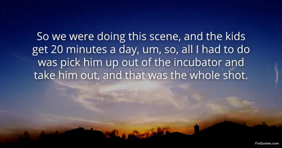 Burton, Steve. "So we were doing this scene, and the kids get 20 minutes a day, um, so, all I had to do was pick him up out of the incubator and take him out, and that was the whole shot." FixQuotes. January 15, 2026. https://fixquotes.com/quotes/so-we-were-doing-this-scene-and-the-kids-get-20-168525/.