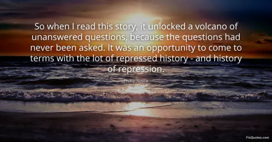 Noyce, Phillip. "So when I read this story, it unlocked a volcano of unanswered questions, because the questions had never been asked. It was an opportunity to come to terms with the lot of repressed history - and history of repression." FixQuotes. January 16, 2026. https://fixquotes.com/quotes/so-when-i-read-this-story-it-unlocked-a-volcano-134479/.