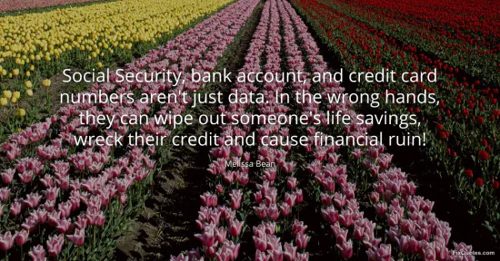 Bean, Melissa. "Social Security, bank account, and credit card numbers aren't just data. In the wrong hands, they can wipe out someone's life savings, wreck their credit and cause financial ruin!" FixQuotes. February 18, 2026. https://fixquotes.com/quotes/social-security-bank-account-and-credit-card-72775/.