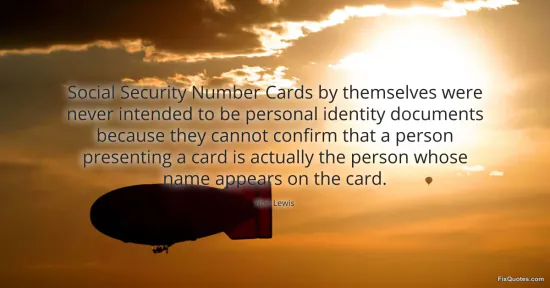 Lewis, Ron. "Social Security Number Cards by themselves were never intended to be personal identity documents because they cannot confirm that a person presenting a card is actually the person whose name appears on the card." FixQuotes. January 16, 2026. https://fixquotes.com/quotes/social-security-number-cards-by-themselves-were-106711/.
