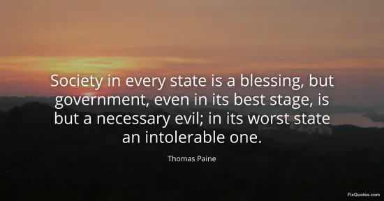 Paine, Thomas. "Society in every state is a blessing, but government, even in its best stage, is but a necessary evil; in its worst state an intolerable one." FixQuotes. January 16, 2026. https://fixquotes.com/quotes/society-in-every-state-is-a-blessing-but-137796/.