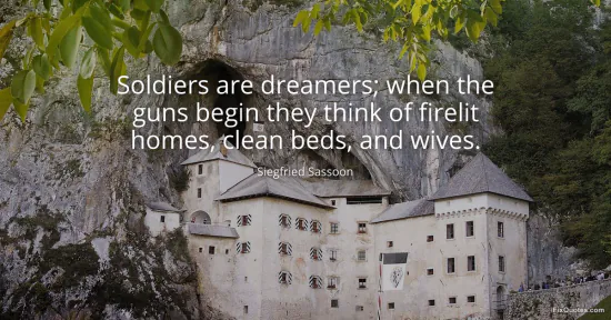 Sassoon, Siegfried. "Soldiers are dreamers; when the guns begin they think of firelit homes, clean beds, and wives." FixQuotes. January 16, 2026. https://fixquotes.com/quotes/soldiers-are-dreamers-when-the-guns-begin-they-84168/.