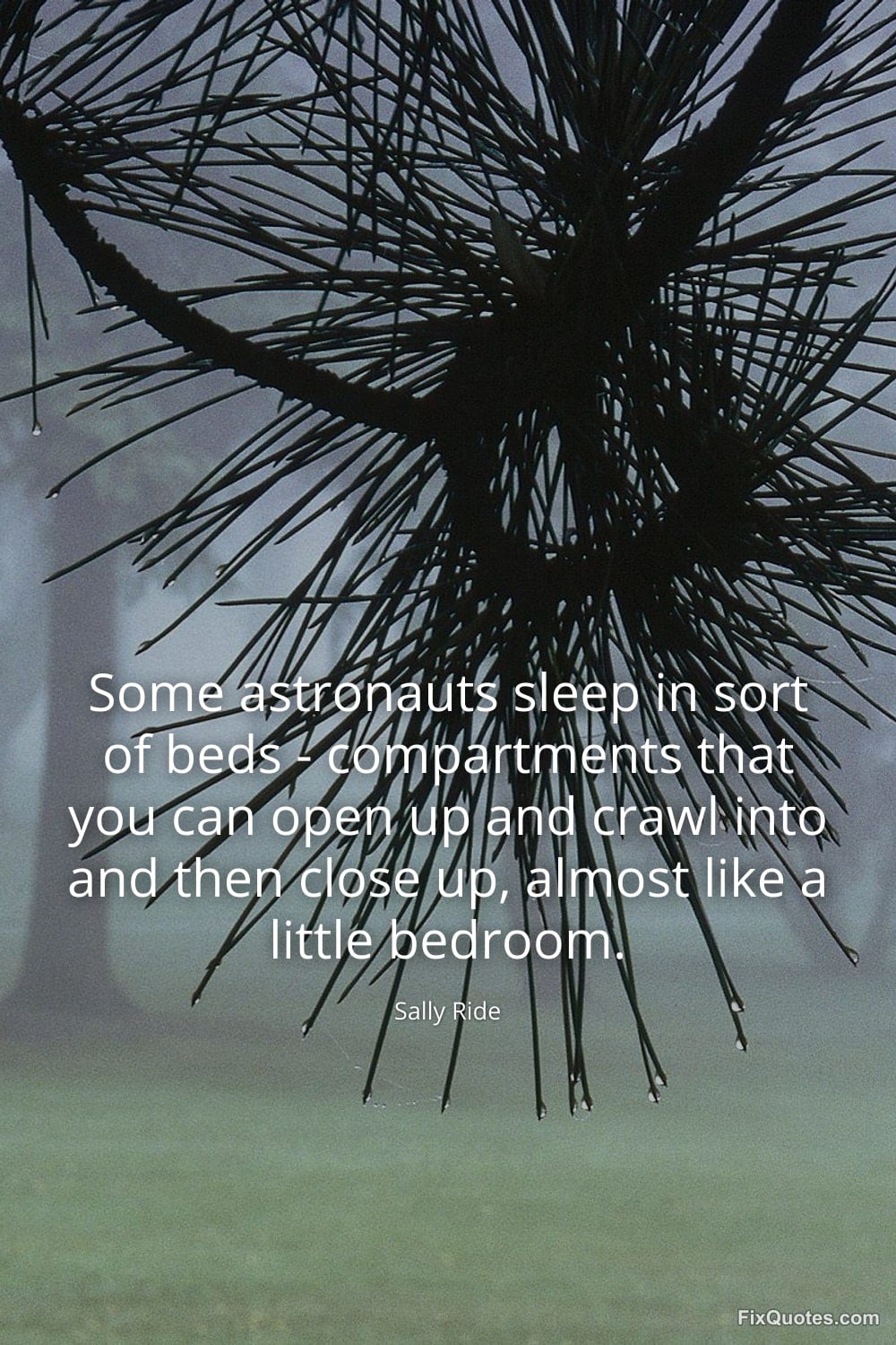 Ride, Sally. "Some astronauts sleep in sort of beds - compartments that you can open up and crawl into and then close up, almost like a little bedroom." FixQuotes. January 18, 2026. https://fixquotes.com/quotes/some-astronauts-sleep-in-sort-of-beds-21657/.