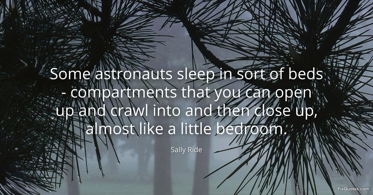 Ride, Sally. (2026, January 18). Some astronauts sleep in sort of beds - compartments that you can open up and crawl into and then close up, almost like a little bedroom. FixQuotes. https://fixquotes.com/quotes/some-astronauts-sleep-in-sort-of-beds-21657/