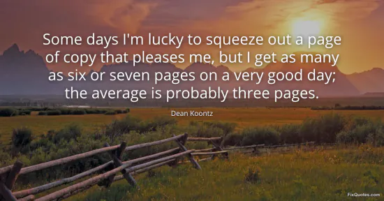 Koontz, Dean. "Some days I'm lucky to squeeze out a page of copy that pleases me, but I get as many as six or seven pages on a very good day; the average is probably three pages." FixQuotes. January 16, 2026. https://fixquotes.com/quotes/some-days-im-lucky-to-squeeze-out-a-page-of-copy-139218/.