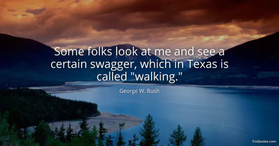 Bush, George W. "Some folks look at me and see a certain swagger, which in Texas is called "walking."." FixQuotes. January 18, 2026. https://fixquotes.com/quotes/some-folks-look-at-me-and-see-a-certain-swagger-7289/.