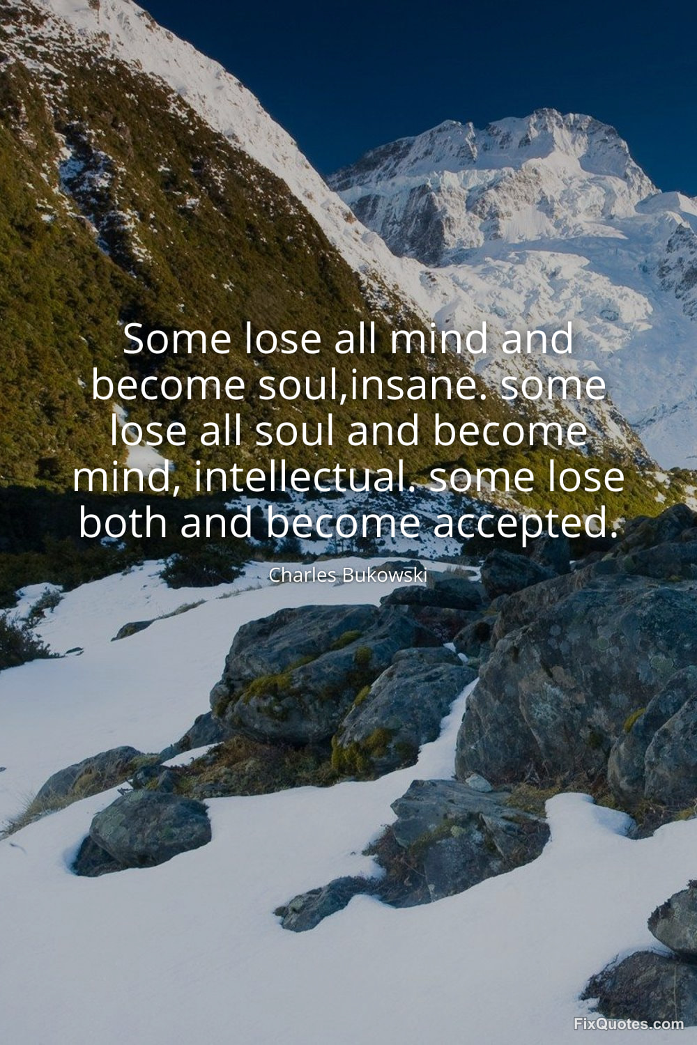 Bukowski, Charles. (2026, February 10). Some lose all mind and become soul,insane. some lose all soul and become mind, intellectual. some lose both and become accepted. FixQuotes. https://fixquotes.com/quotes/some-lose-all-mind-and-become-soulinsane-some-185138/