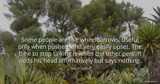 Haskins, Henry S. "Some people are like wheelbarrows; useful only when pushed, and very easily upset. The time to stop talking is when the other person nods his head affirmatively but says nothing." FixQuotes. January 15, 2026. https://fixquotes.com/quotes/some-people-are-like-wheelbarrows-useful-only-105654/.