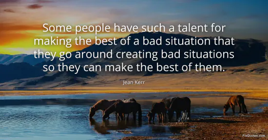 Kerr, Jean. (2026, January 18). Some people have such a talent for making the best of a bad situation that they go around creating bad situations so they can make the best of them. FixQuotes. https://fixquotes.com/quotes/some-people-have-such-a-talent-for-making-the-6762/