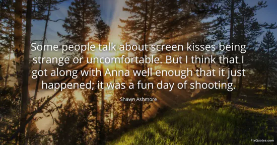 Ashmore, Shawn. "Some people talk about screen kisses being strange or uncomfortable. But I think that I got along with Anna well enough that it just happened; it was a fun day of shooting." FixQuotes. Accessed February 2, 2026. https://fixquotes.com/quotes/some-people-talk-about-screen-kisses-being-148053/.