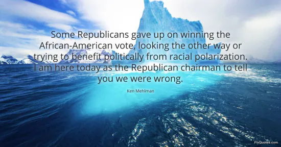 Mehlman, Ken. "Some Republicans gave up on winning the African-American vote, looking the other way or trying to benefit politically from racial polarization. I am here today as the Republican chairman to tell you we were wrong." FixQuotes. January 14, 2026. https://fixquotes.com/quotes/some-republicans-gave-up-on-winning-the-96606/.