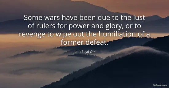 Orr, John Boyd. "Some wars have been due to the lust of rulers for power and glory, or to revenge to wipe out the humiliation of a former defeat." FixQuotes. January 17, 2026. https://fixquotes.com/quotes/some-wars-have-been-due-to-the-lust-of-rulers-for-71243/.
