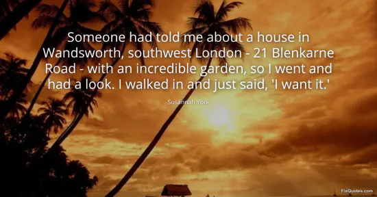York, Susannah. "Someone had told me about a house in Wandsworth, southwest London - 21 Blenkarne Road - with an incredible garden, so I went and had a look. I walked in and just said, 'I want it.'." FixQuotes. January 15, 2026. https://fixquotes.com/quotes/someone-had-told-me-about-a-house-in-wandsworth-102518/.