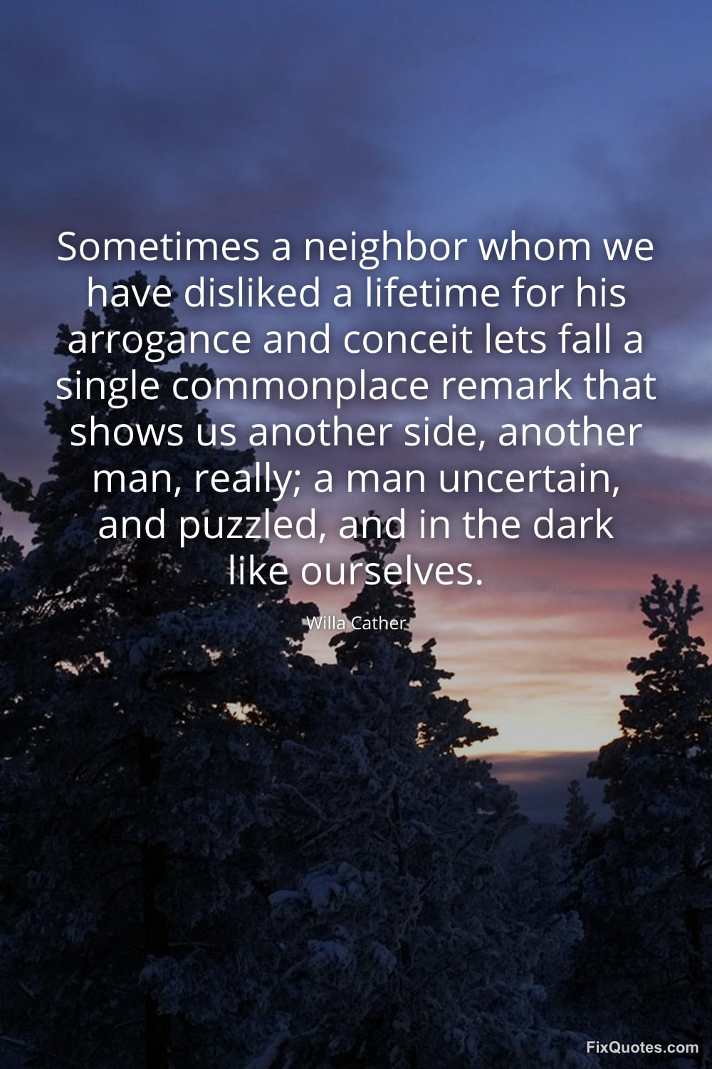 Cather, Willa. (2026, January 15). Sometimes a neighbor whom we have disliked a lifetime for his arrogance and conceit lets fall a single commonplace remark that shows us another side, another man, really; a man uncertain, and puzzled, and in the dark like ourselves. FixQuotes. https://fixquotes.com/quotes/sometimes-a-neighbor-whom-we-have-disliked-a-156265/