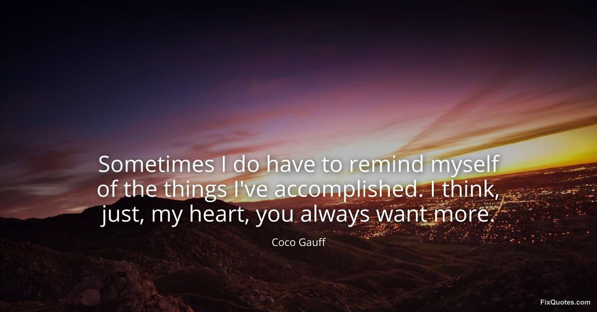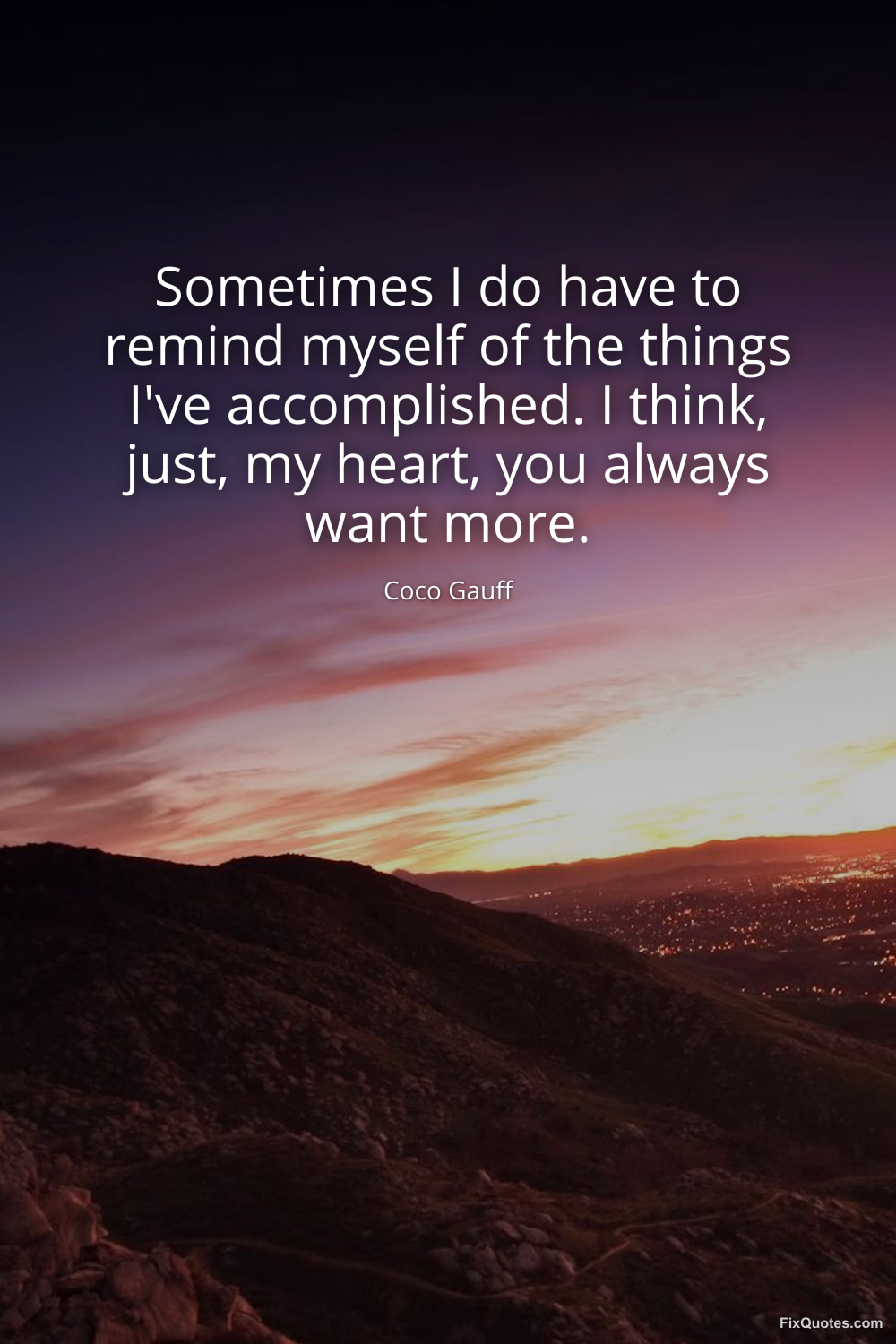Gauff, Coco. "Sometimes I do have to remind myself of the things I've accomplished. I think, just, my heart, you always want more." FixQuotes. March 17, 2026. https://fixquotes.com/quotes/sometimes-i-do-have-to-remind-myself-of-the-186137/.