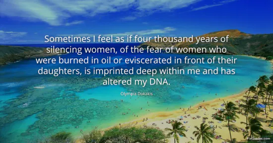 Dukakis, Olympia. "Sometimes I feel as if four thousand years of silencing women, of the fear of women who were burned in oil or eviscerated in front of their daughters, is imprinted deep within me and has altered my DNA." FixQuotes. January 16, 2026. https://fixquotes.com/quotes/sometimes-i-feel-as-if-four-thousand-years-of-116435/.