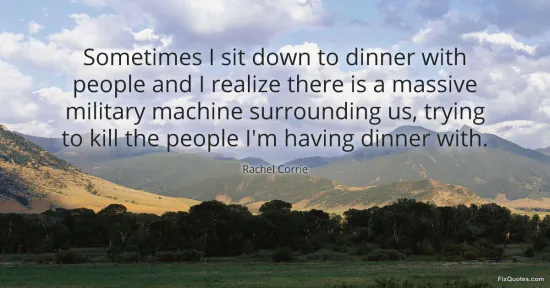 Corrie, Rachel. "Sometimes I sit down to dinner with people and I realize there is a massive military machine surrounding us, trying to kill the people I'm having dinner with." FixQuotes. January 15, 2026. https://fixquotes.com/quotes/sometimes-i-sit-down-to-dinner-with-people-and-i-91699/.