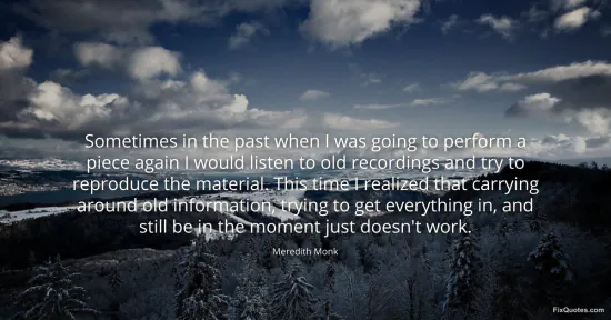 Monk, Meredith. "Sometimes in the past when I was going to perform a piece again I would listen to old recordings and try to reproduce the material. This time I realized that carrying around old information, trying to get everything in, and still be in the moment just doesn't work." FixQuotes. January 16, 2026. https://fixquotes.com/quotes/sometimes-in-the-past-when-i-was-going-to-perform-88729/.
