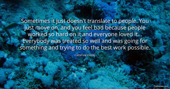 Keener, Catherine. (2026, January 15). Sometimes it just doesn't translate to people. You just move on, and you feel bad because people worked so hard on it and everyone loved it... Everybody was treated so well and was going for something and trying to do the best work possible. FixQuotes. https://fixquotes.com/quotes/sometimes-it-just-doesnt-translate-to-people-you-141588/