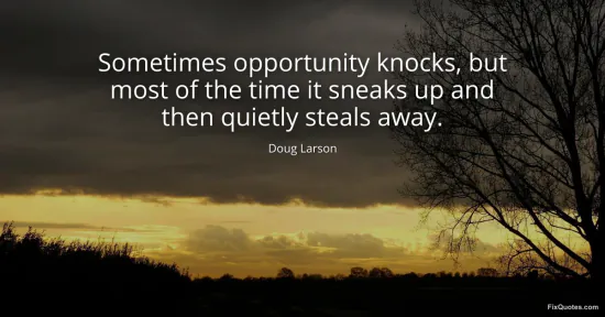 Larson, Doug. "Sometimes opportunity knocks, but most of the time it sneaks up and then quietly steals away." FixQuotes. January 18, 2026. https://fixquotes.com/quotes/sometimes-opportunity-knocks-but-most-of-the-time-18649/.