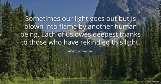Schweitzer, Albert. (2026, February 12). Sometimes our light goes out but is blown into flame by another human being. Each of us owes deepest thanks to those who have rekindled this light. FixQuotes. https://fixquotes.com/quotes/sometimes-our-light-goes-out-but-is-blown-into-22950/