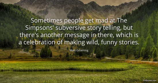 Groening, Matt. "Sometimes people get mad at The Simpsons' subversive story telling, but there's another message in there, which is a celebration of making wild, funny stories." FixQuotes. January 16, 2026. https://fixquotes.com/quotes/sometimes-people-get-mad-at-the-simpsons-88683/.