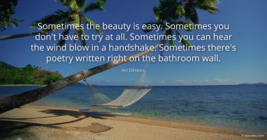 DiFranco, Ani. (2026, January 16). Sometimes the beauty is easy. Sometimes you don't have to try at all. Sometimes you can hear the wind blow in a handshake. Sometimes there's poetry written right on the bathroom wall. FixQuotes. https://fixquotes.com/quotes/sometimes-the-beauty-is-easy-sometimes-you-dont-100667/