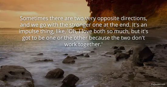 Jacobs, Marc. (2026, January 18). Sometimes there are two very opposite directions, and we go with the stronger one at the end. It's an impulse thing, like, 'Oh, I love both so much, but it's got to be one or the other because the two don't work together.'. FixQuotes. https://fixquotes.com/quotes/sometimes-there-are-two-very-opposite-directions-23197/
