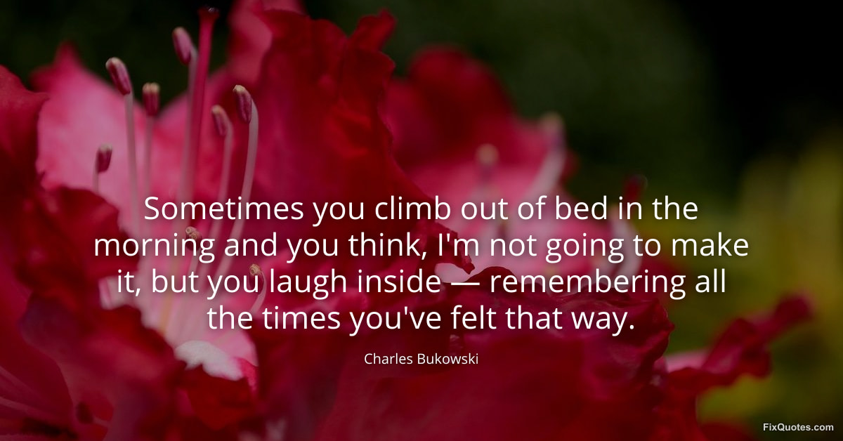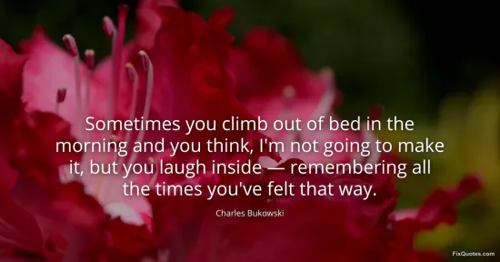 Bukowski, Charles. (2026, February 10). Sometimes you climb out of bed in the morning and you think, I'm not going to make it, but you laugh inside — remembering all the times you've felt that way. FixQuotes. https://fixquotes.com/quotes/sometimes-you-climb-out-of-bed-in-the-morning-and-185145/