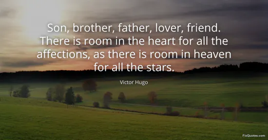 Hugo, Victor. "Son, brother, father, lover, friend. There is room in the heart for all the affections, as there is room in heaven for all the stars." FixQuotes. January 17, 2026. https://fixquotes.com/quotes/son-brother-father-lover-friend-there-is-room-in-36804/.
