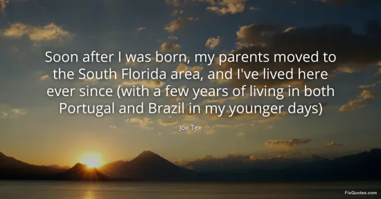 Tex, Joe. (2026, January 16). Soon after I was born, my parents moved to the South Florida area, and I've lived here ever since (with a few years of living in both Portugal and Brazil in my younger days). FixQuotes. https://fixquotes.com/quotes/soon-after-i-was-born-my-parents-moved-to-the-106724/