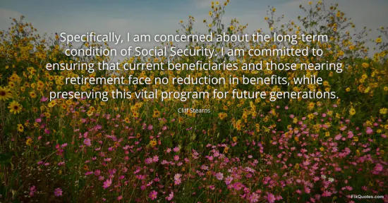 Stearns, Cliff. (2026, January 17). Specifically, I am concerned about the long-term condition of Social Security. I am committed to ensuring that current beneficiaries and those nearing retirement face no reduction in benefits, while preserving this vital program for future generations. FixQuotes. https://fixquotes.com/quotes/specifically-i-am-concerned-about-the-long-term-47531/