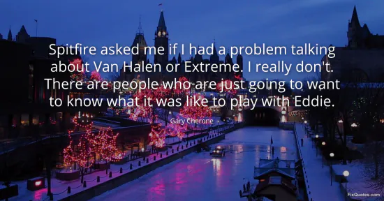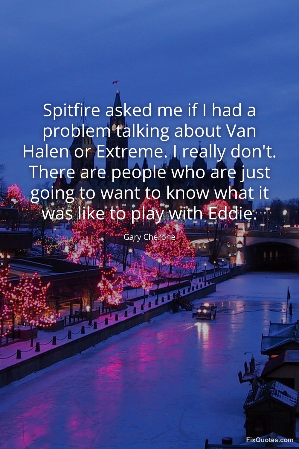 Cherone, Gary. "Spitfire asked me if I had a problem talking about Van Halen or Extreme. I really don't. There are people who are just going to want to know what it was like to play with Eddie." FixQuotes. January 17, 2026. https://fixquotes.com/quotes/spitfire-asked-me-if-i-had-a-problem-talking-66147/.