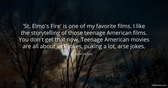 McAvoy, James. "'St. Elmo's Fire' is one of my favorite films. I like the storytelling of those teenage American films. You don't get that now. Teenage American movies are all about sick jokes, puking a lot, arse jokes." FixQuotes. January 15, 2026. https://fixquotes.com/quotes/st-elmos-fire-is-one-of-my-favorite-films-i-like-151718/.