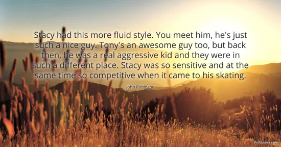 Robinson, John. "Stacy had this more fluid style. You meet him, he's just such a nice guy. Tony's an awesome guy too, but back then, he was a real aggressive kid and they were in such a different place. Stacy was so sensitive and at the same time so competitive when it came to his skating." FixQuotes. January 16, 2026. https://fixquotes.com/quotes/stacy-had-this-more-fluid-style-you-meet-him-hes-86619/.