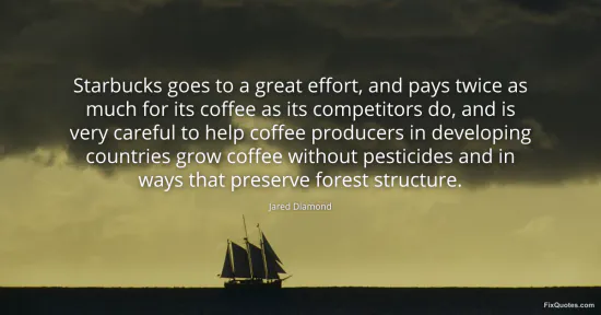 Diamond, Jared. "Starbucks goes to a great effort, and pays twice as much for its coffee as its competitors do, and is very careful to help coffee producers in developing countries grow coffee without pesticides and in ways that preserve forest structure." FixQuotes. January 16, 2026. https://fixquotes.com/quotes/starbucks-goes-to-a-great-effort-and-pays-twice-106493/.