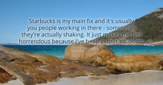 Manson, Shirley. "Starbucks is my main fix and it's usually you people working in there - sometimes they're actually shaking. It just makes me feel horrendous because I've been in that situation." FixQuotes. January 15, 2026. https://fixquotes.com/quotes/starbucks-is-my-main-fix-and-its-usually-you-152278/.