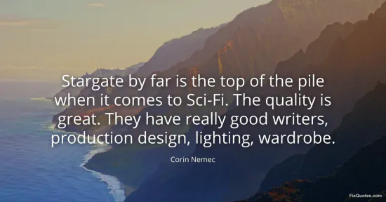 Nemec, Corin. (2026, January 17). Stargate by far is the top of the pile when it comes to Sci-Fi. The quality is great. They have really good writers, production design, lighting, wardrobe. FixQuotes. https://fixquotes.com/quotes/stargate-by-far-is-the-top-of-the-pile-when-it-42779/