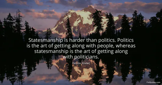 Knebel, Fletcher. (2026, January 16). Statesmanship is harder than politics. Politics is the art of getting along with people, whereas statesmanship is the art of getting along with politicians. FixQuotes. https://fixquotes.com/quotes/statesmanship-is-harder-than-politics-politics-is-114908/