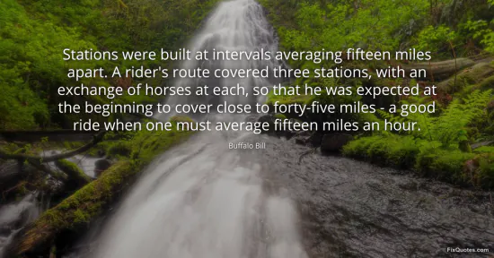 Bill, Buffalo. (2026, January 17). Stations were built at intervals averaging fifteen miles apart. A rider's route covered three stations, with an exchange of horses at each, so that he was expected at the beginning to cover close to forty-five miles - a good ride when one must average fifteen miles an hour. FixQuotes. https://fixquotes.com/quotes/stations-were-built-at-intervals-averaging-33543/