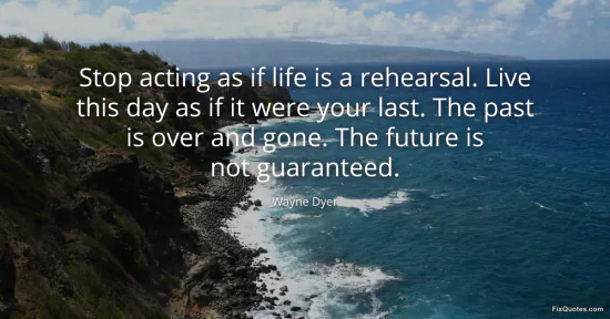 Dyer, Wayne. "Stop acting as if life is a rehearsal. Live this day as if it were your last. The past is over and gone. The future is not guaranteed." FixQuotes. January 17, 2026. https://fixquotes.com/quotes/stop-acting-as-if-life-is-a-rehearsal-live-this-36349/.