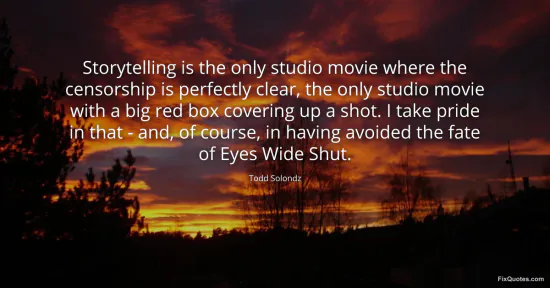 Solondz, Todd. "Storytelling is the only studio movie where the censorship is perfectly clear, the only studio movie with a big red box covering up a shot. I take pride in that - and, of course, in having avoided the fate of Eyes Wide Shut." FixQuotes. January 15, 2026. https://fixquotes.com/quotes/storytelling-is-the-only-studio-movie-where-the-145467/.
