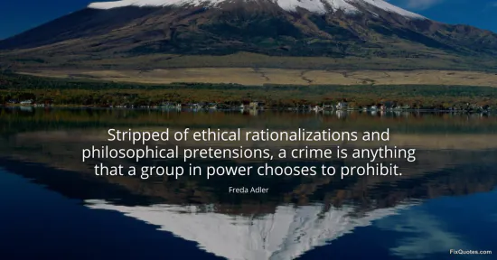 Adler, Freda. (2026, January 16). Stripped of ethical rationalizations and philosophical pretensions, a crime is anything that a group in power chooses to prohibit. FixQuotes. https://fixquotes.com/quotes/stripped-of-ethical-rationalizations-and-124825/