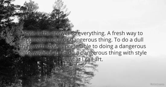 Bukowski, Charles. (2026, February 10). Style is the answer to everything. A fresh way to approach a dull or dangerous thing. To do a dull thing with style is preferable to doing a dangerous thing without it. To do a dangerous thing with style is what I call art. FixQuotes. https://fixquotes.com/quotes/style-is-the-answer-to-everything-a-fresh-way-to-185158/