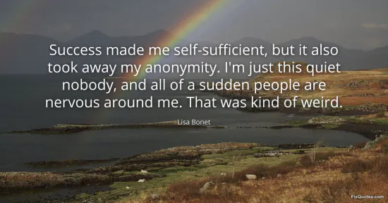 Bonet, Lisa. "Success made me self-sufficient, but it also took away my anonymity. I'm just this quiet nobody, and all of a sudden people are nervous around me. That was kind of weird." FixQuotes. January 16, 2026. https://fixquotes.com/quotes/success-made-me-self-sufficient-but-it-also-took-118593/.
